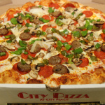 Tomato sauce, pepperoni, sausage, mushrooms, green peppers & onions