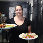 Gyro meat with lettuce, feta cheese, tomatoes, onions and kalamata olives with pita bread and tzatziki cucumbers sauce