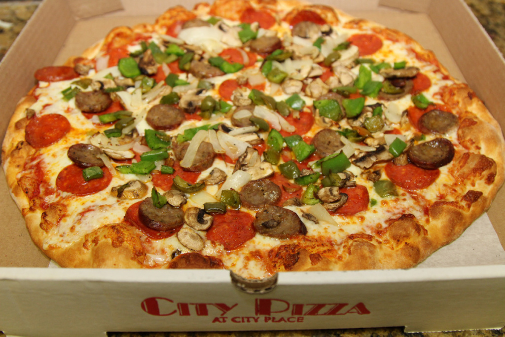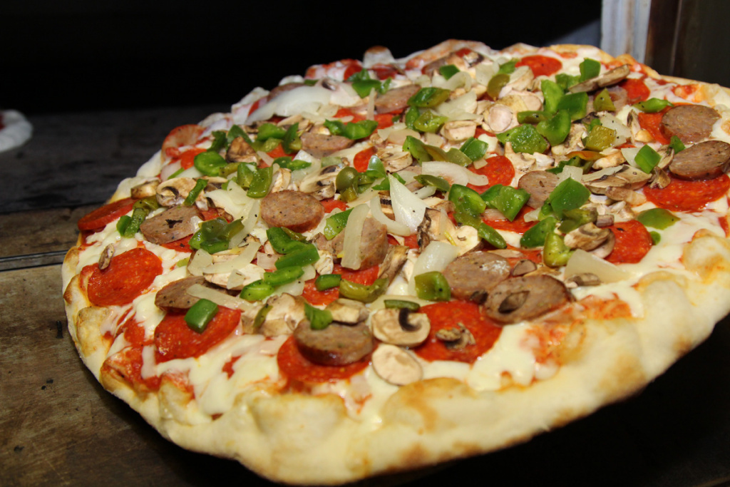 Tomato sauce, pepperoni, sausage, mushrooms, green peppers & onions
